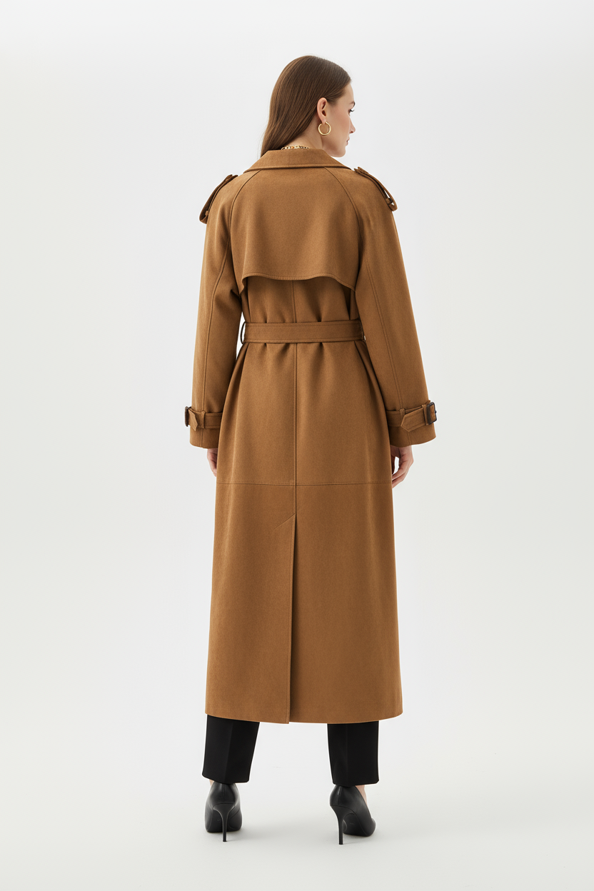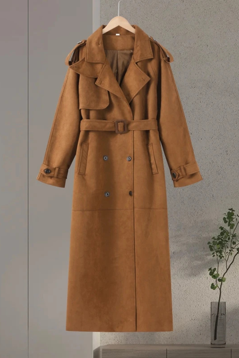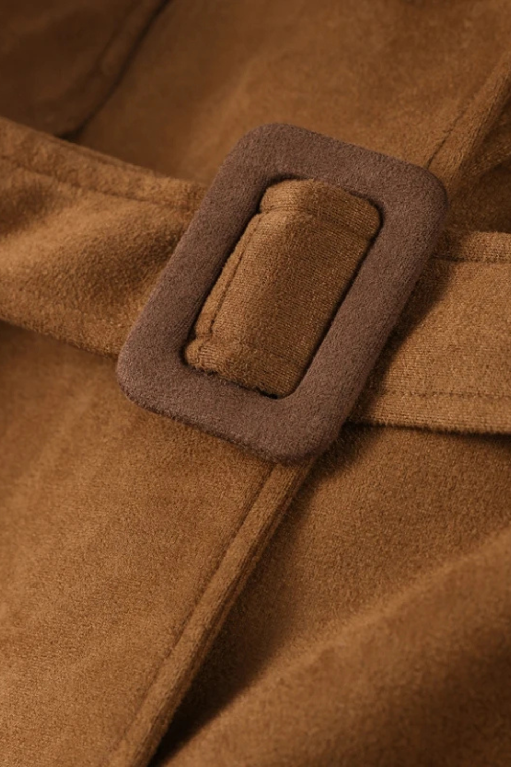 Crafted from soft faux suede, it features a turn-down collar, long silhouette, and a belted waist that flatters the figure while adding structure.
