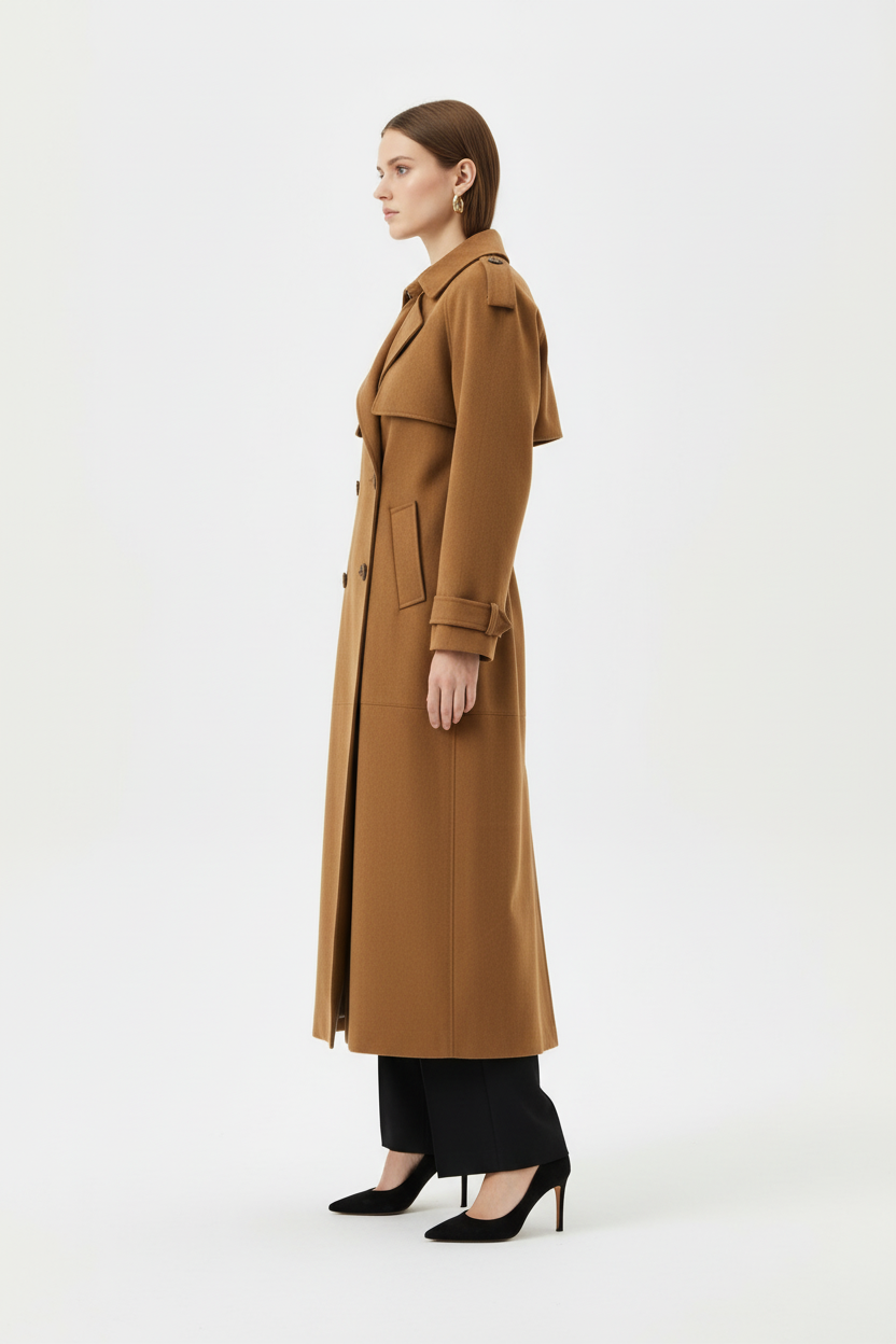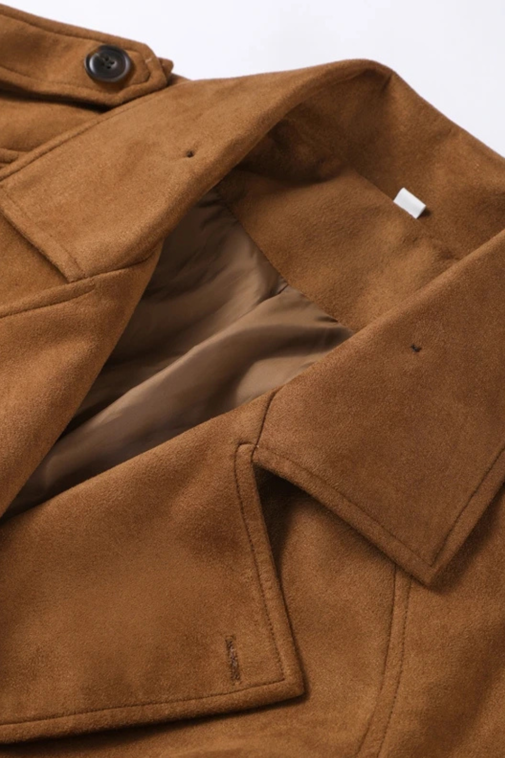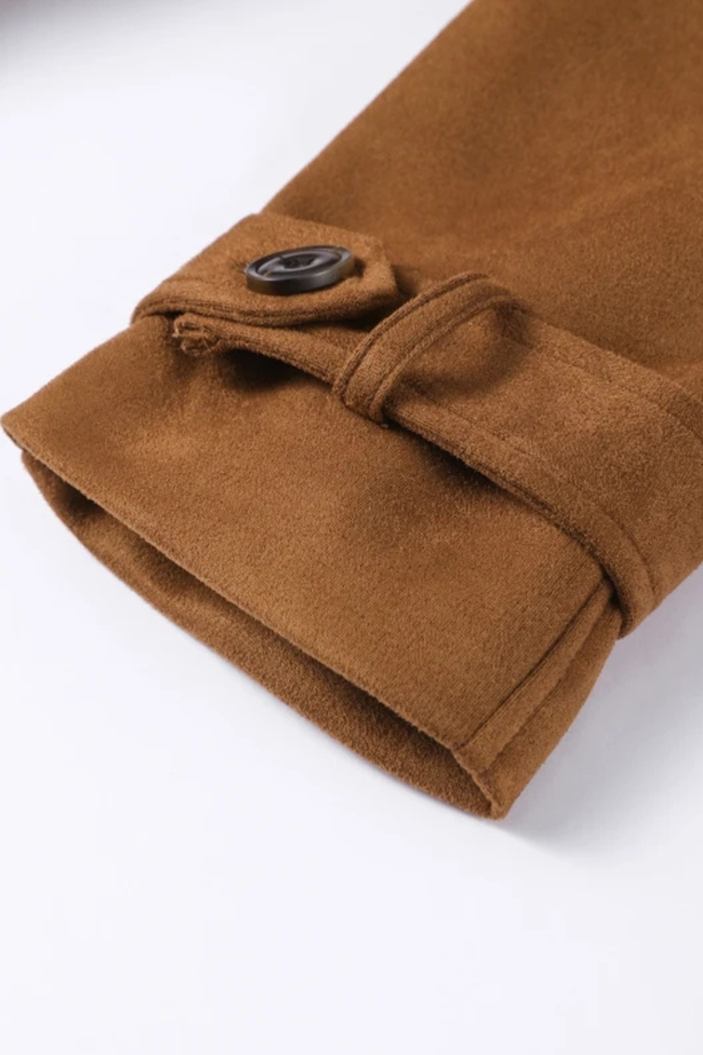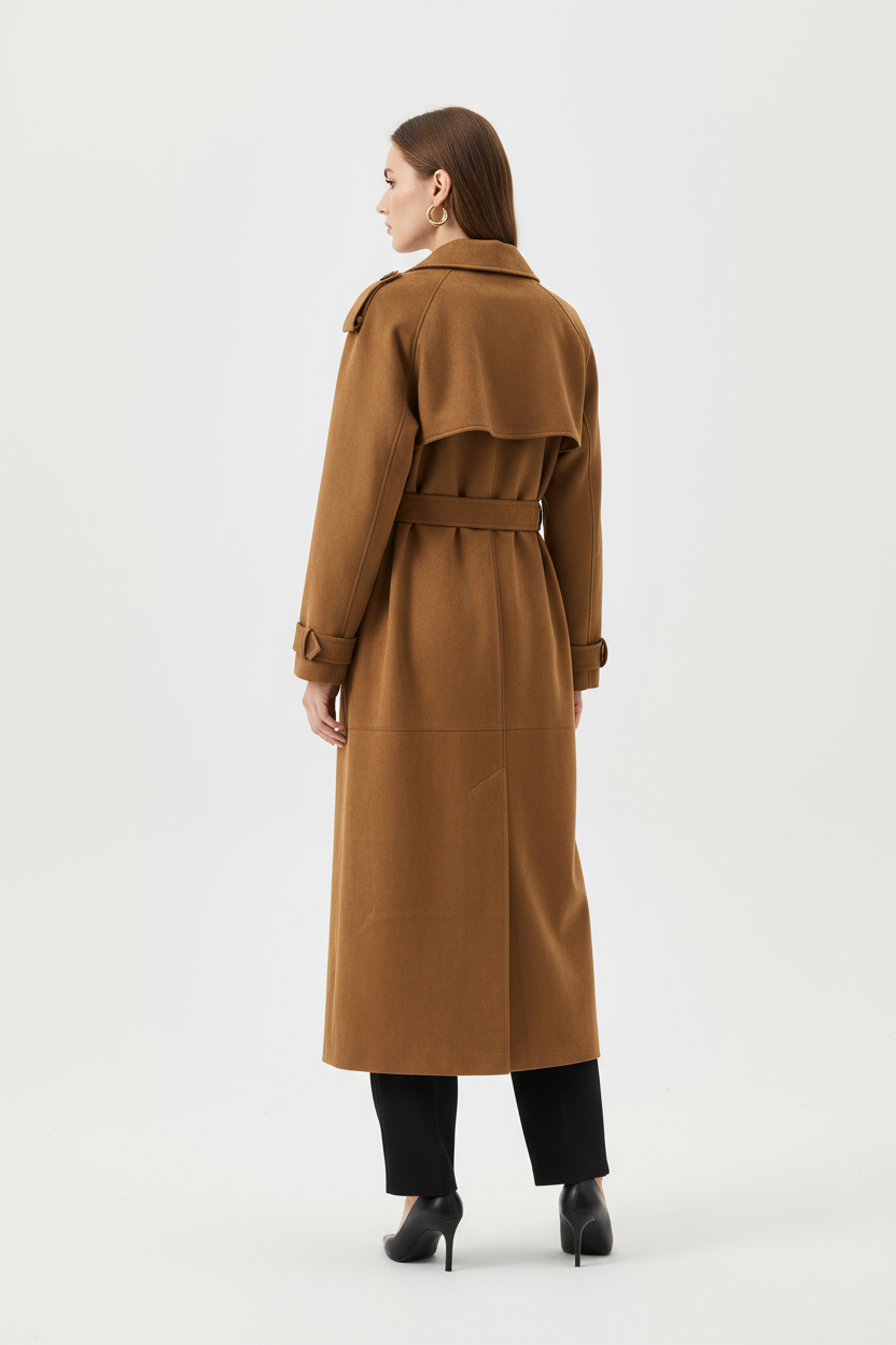 Crafted from soft faux suede, it features a turn-down collar, long silhouette, and a belted waist that flatters the figure while adding structure.