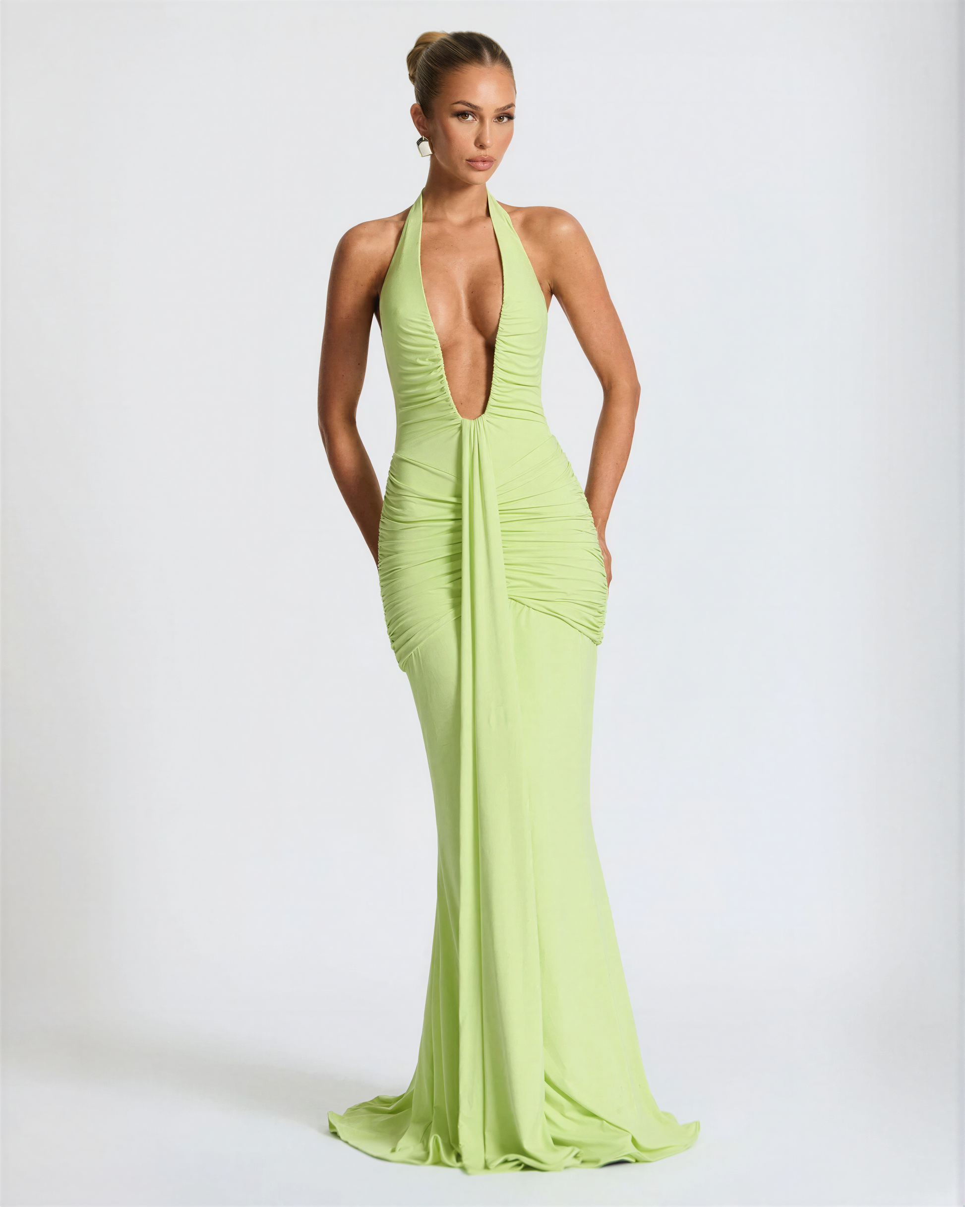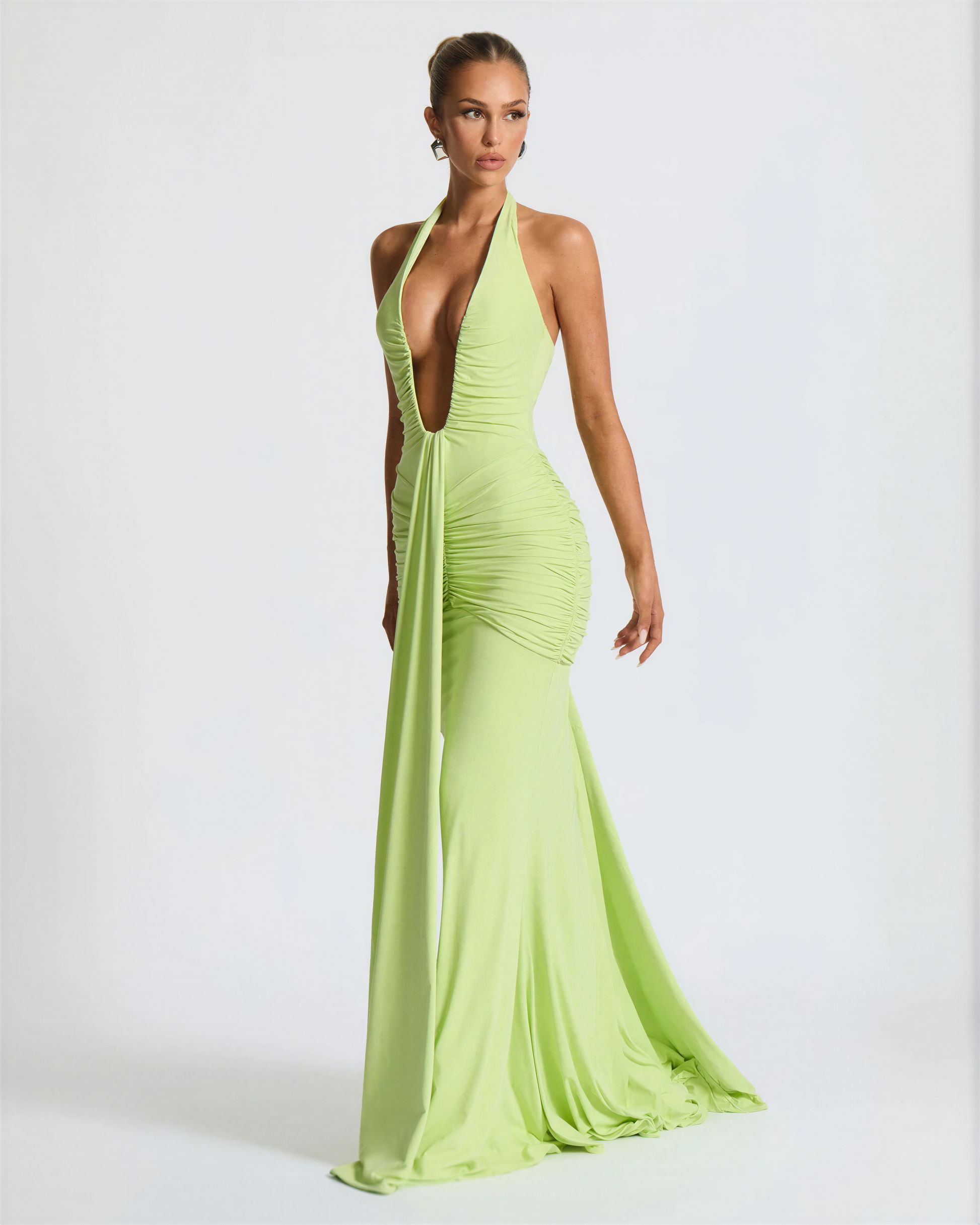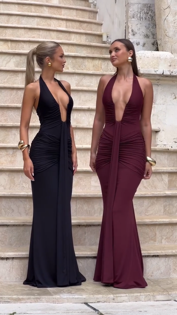 The ‘Juliette’ Dress exudes pure evening allure with its flowing draped silhouette and daring neckline.