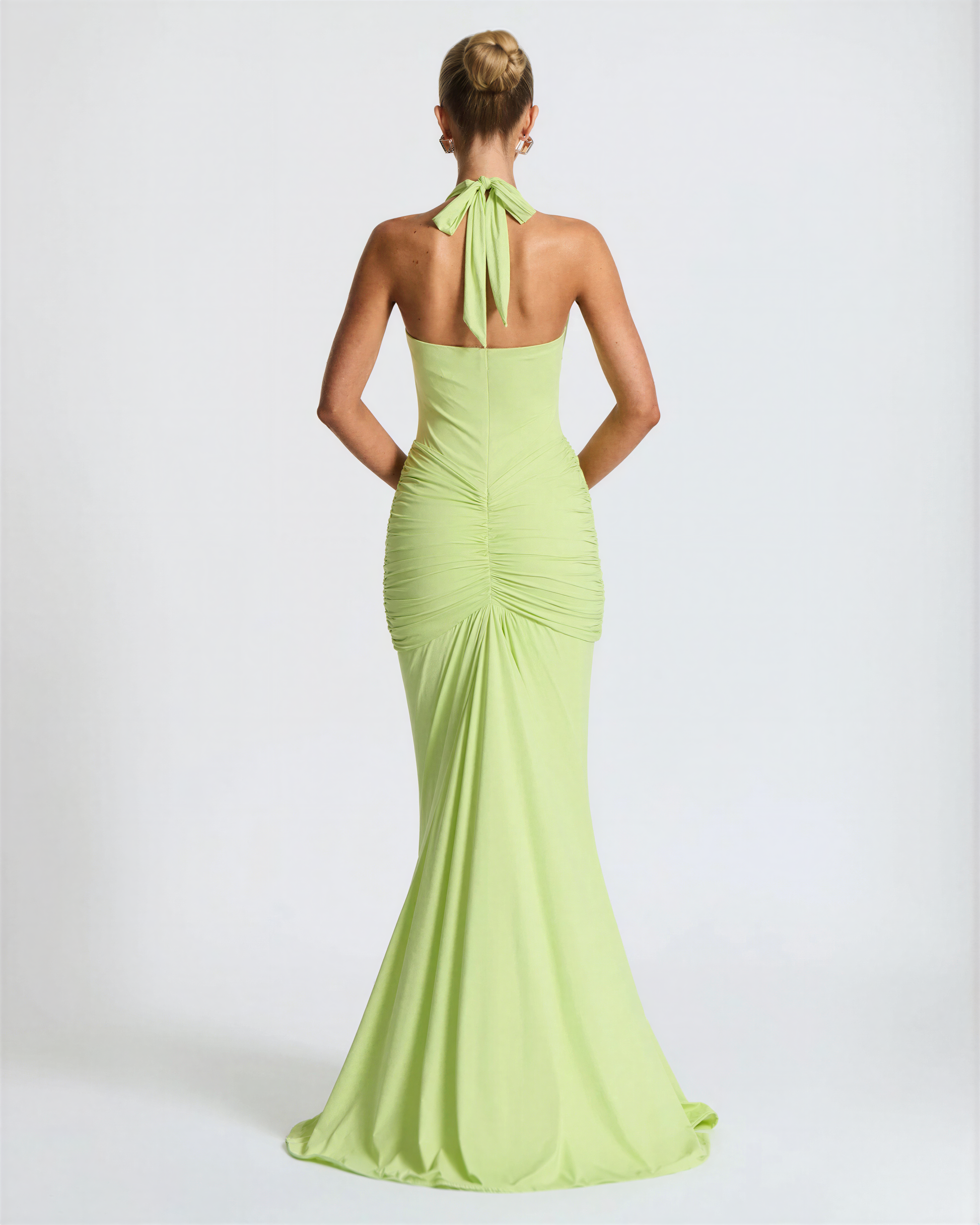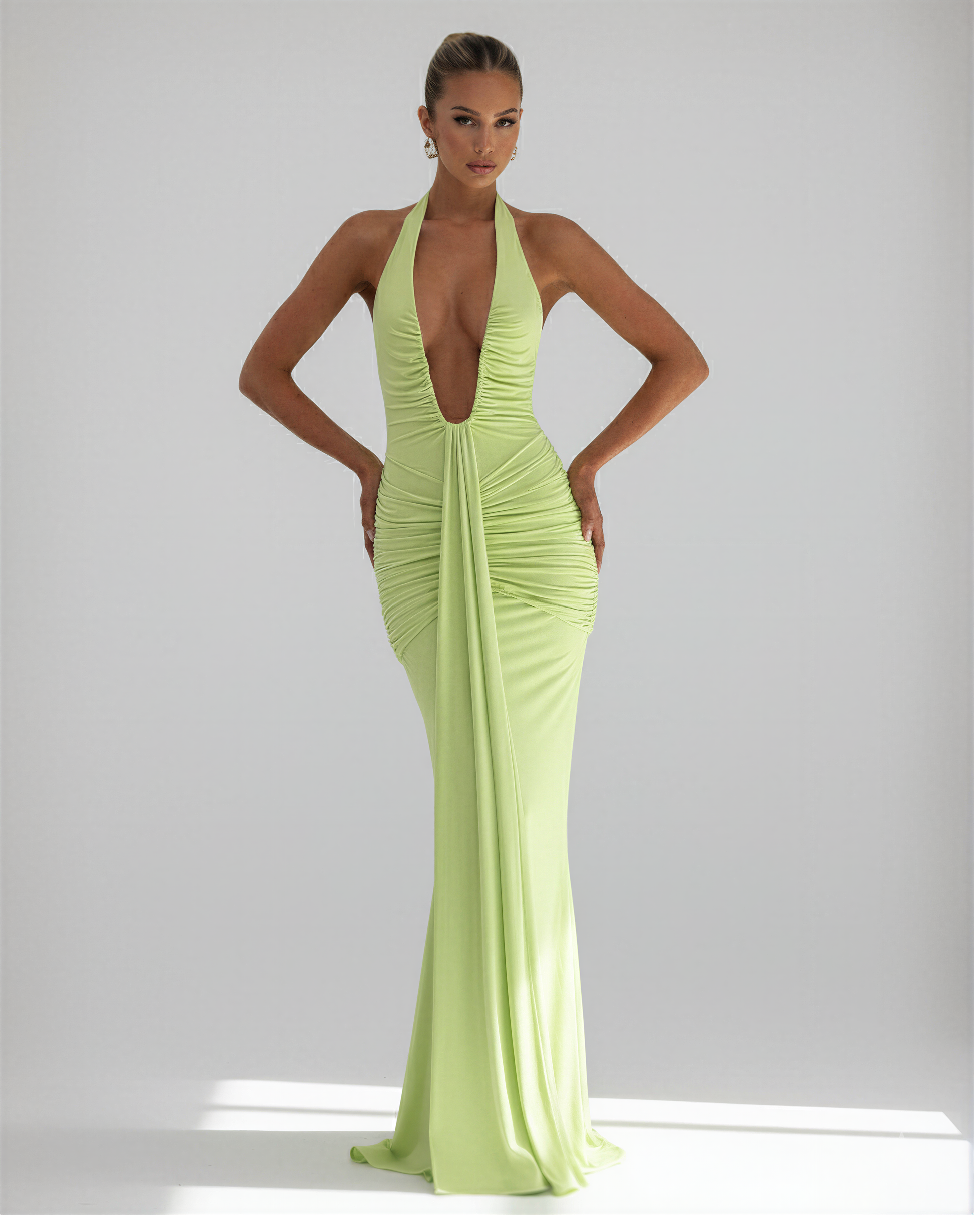 The rushed detailing enhances your shape, while the floor-length hem brings movement and grace to every step.