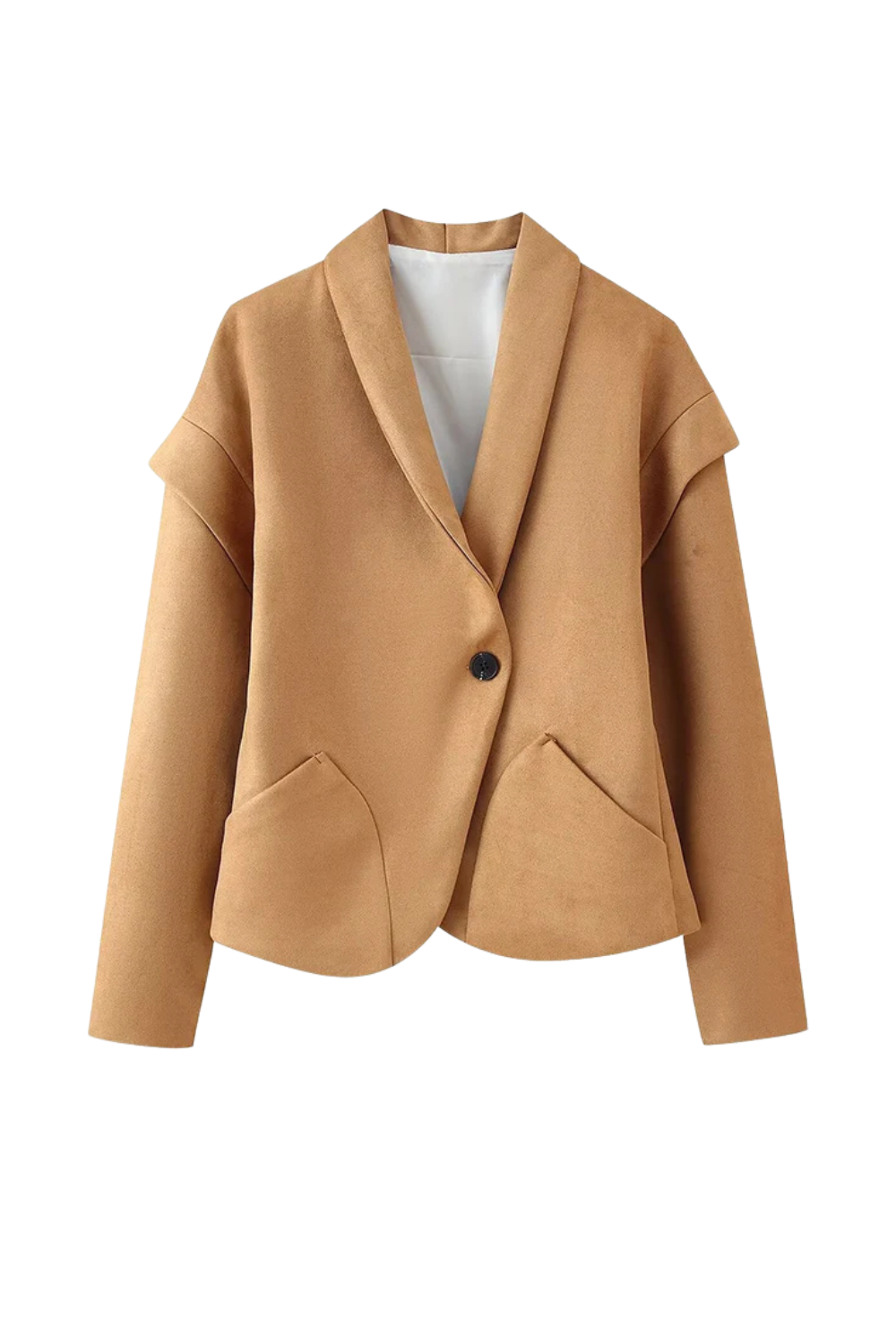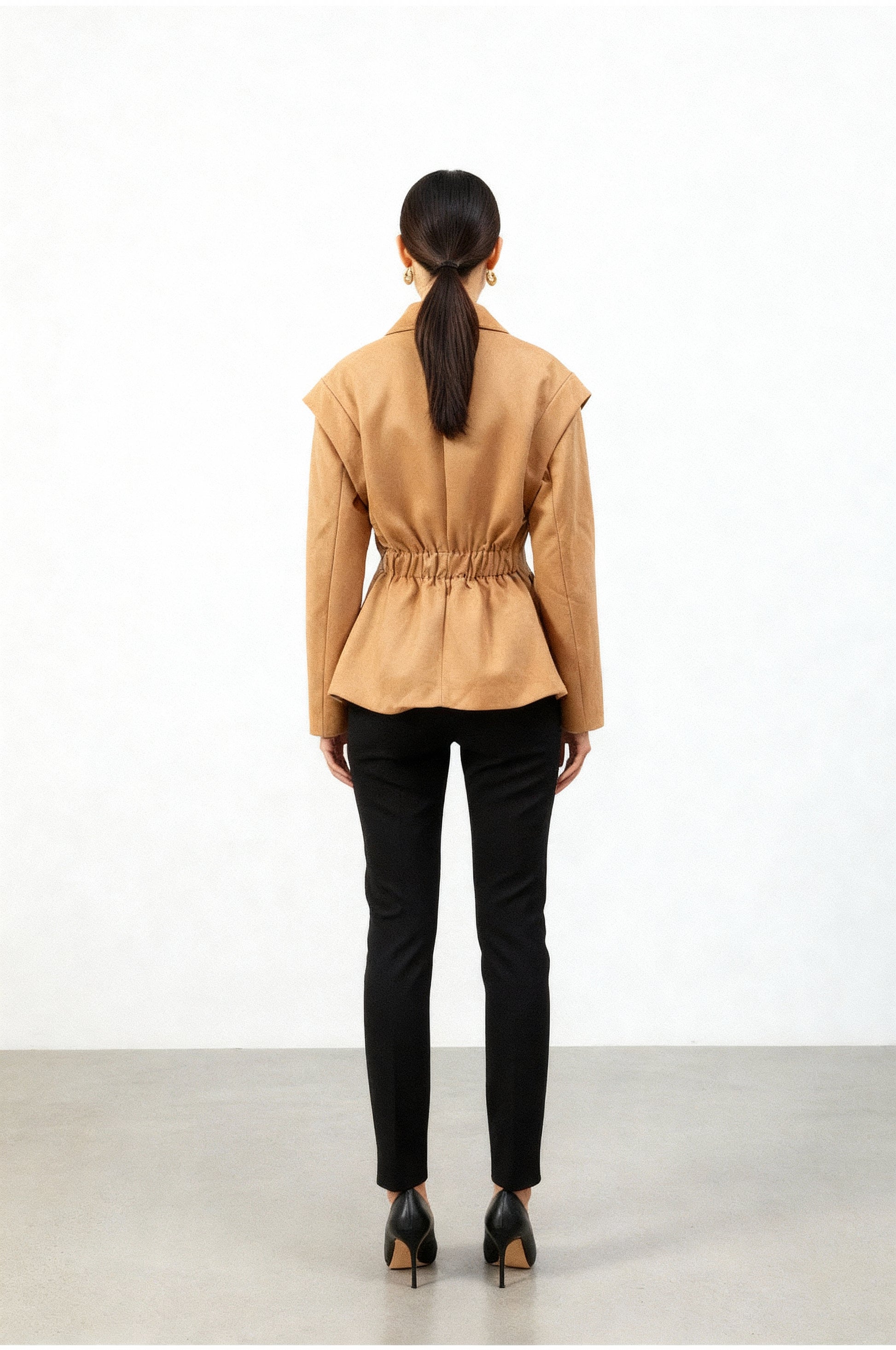 Featuring sharp shoulder pads, a flattering cinched waist, and a sleek single-breasted front, it defines feminine confidence with a clean, tailored silhouette.