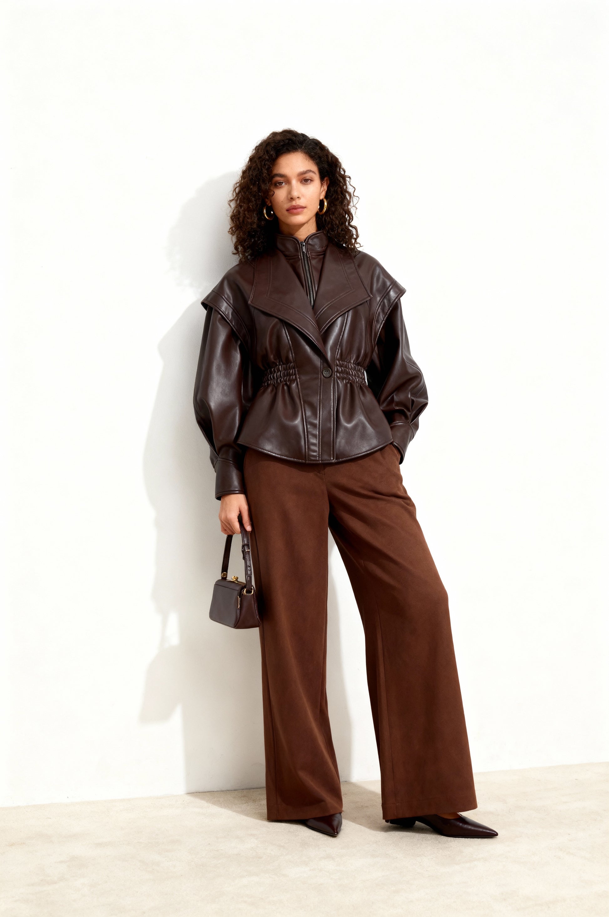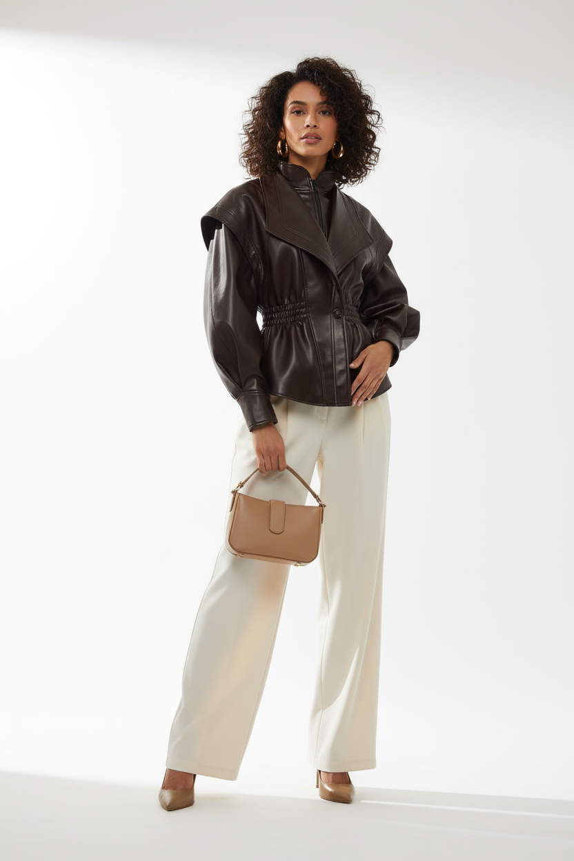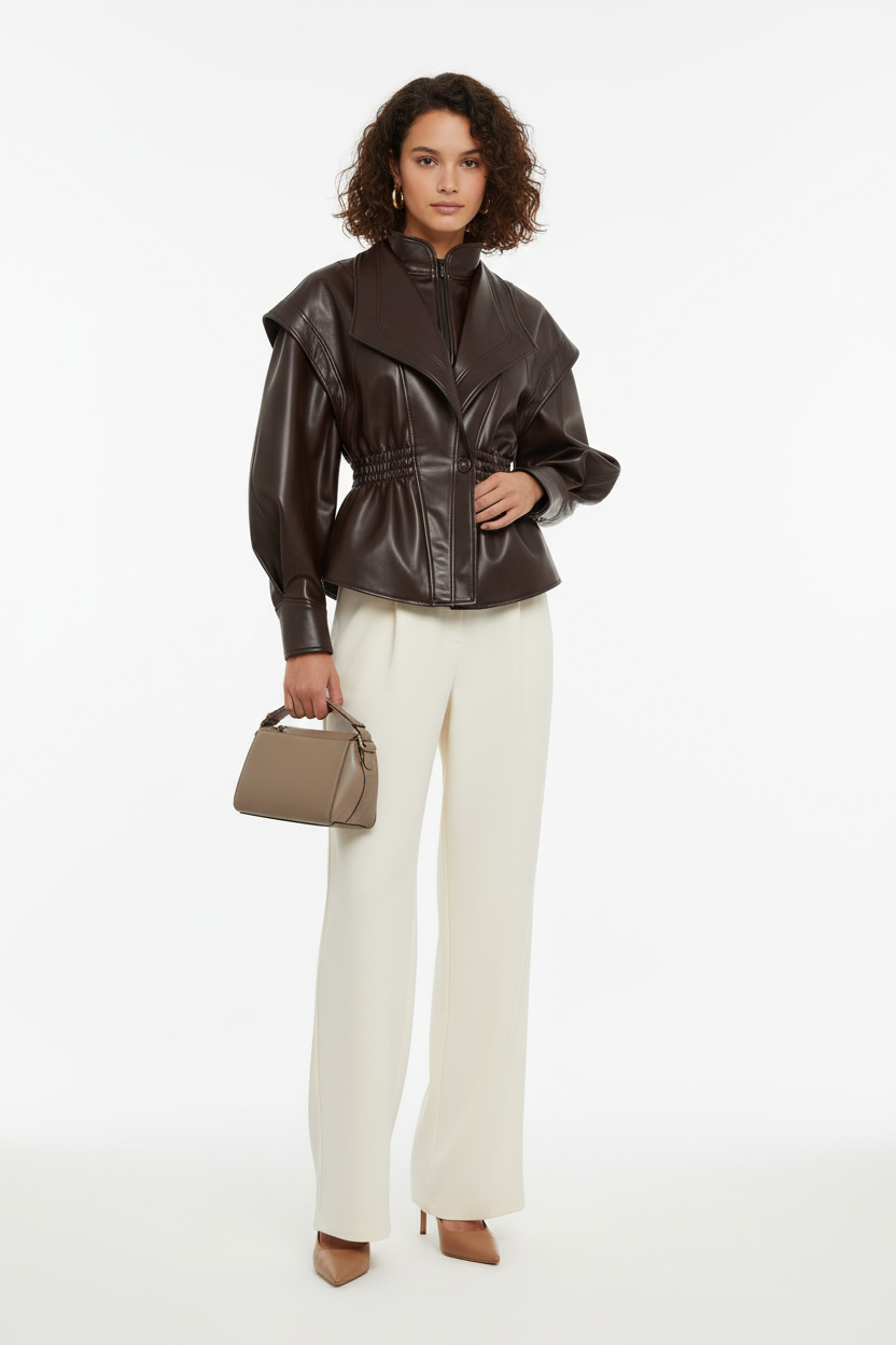Crafted from smooth faux leather, it features a dramatic turn-down collar, voluminous puffy sleeves, and a sleek zip-front closure.