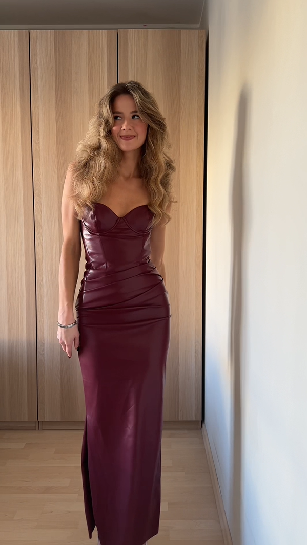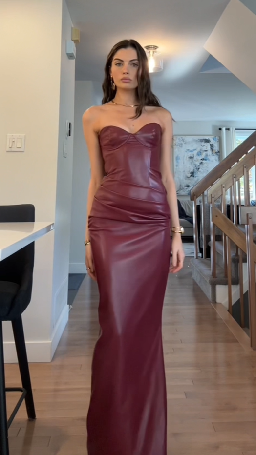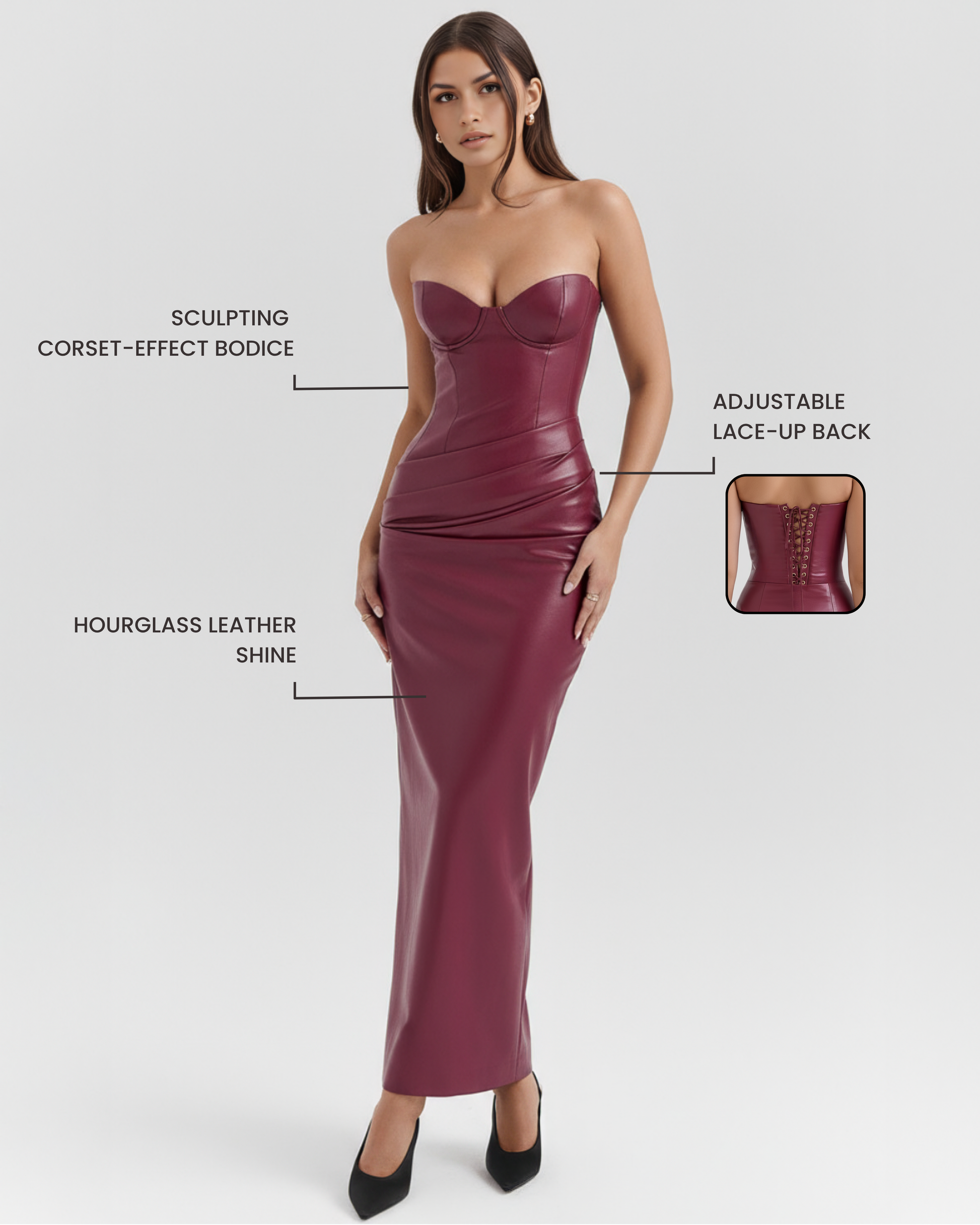 Our 'Vanessa' midi is a bold re-imagination of timeless glamour, designed to make a statement while sculpting every curve. Crafted from stretch vegan leather, this strapless dress features a cupped bodice for structure and support, paired with a sleek skirt that drapes effortlessly from the hips. The dramatic lace-up back detail adds a striking finish, blending elegance with a touch of daring allure. With its body-hugging silhouette and flawless tailoring, Vanessa is the definition of sophistication with an edge.